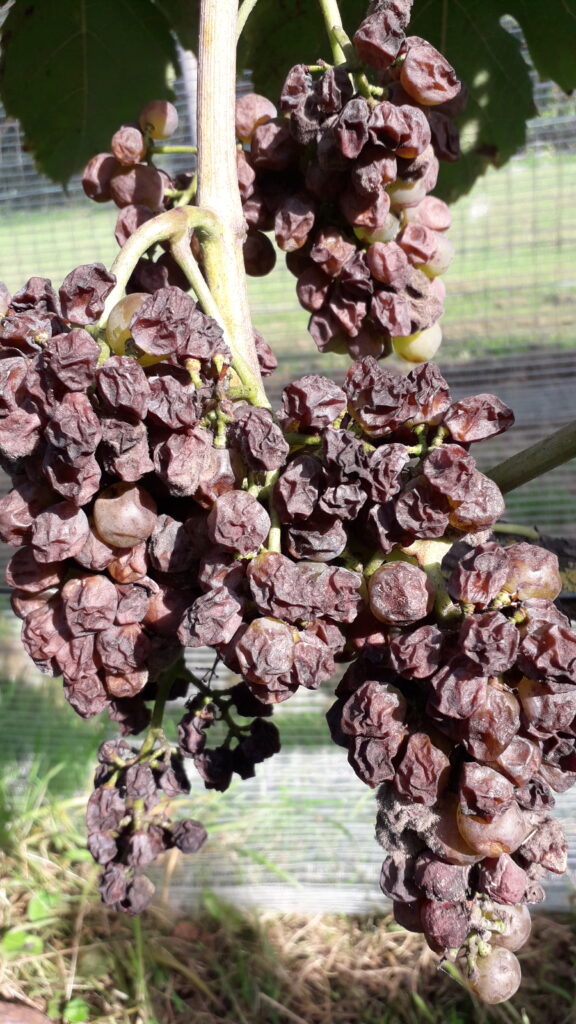 Dit jaar was de bloei erg vroeg en de eerste helft van de zomer gaf een goede ontwikkeling van de trossen te zien. Zoals het er nu uitziet, zal het suikergehalte behoorlijk oplopen. Door met een refractometer regelmatig te meten en tegelijkertijd af en toe wat sap af te nemen voor een zuurmeting, kan je de balans tussen zoet en zuur een beetje volgen.